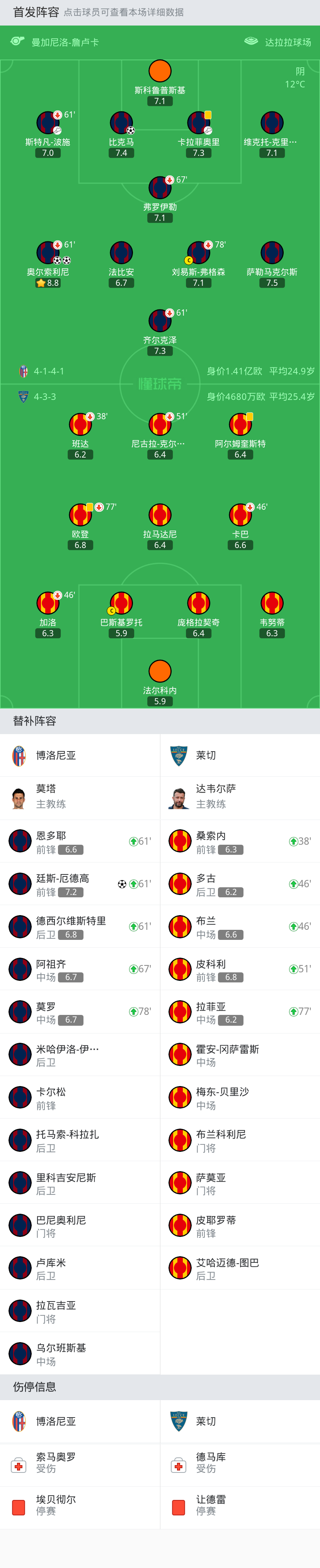 北京时间12月3日意甲联赛第14轮,莱切主场对阵博洛尼亚。