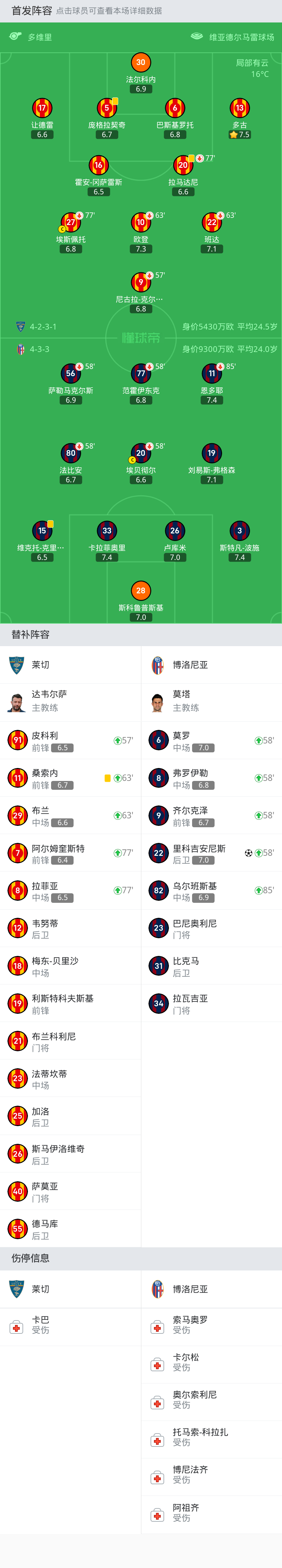 莱切 首发:30-法尔科内, 20-拉马达尼, 6-巴斯基罗托, 5-庞格拉契奇, 10-欧登, 9-尼古拉-克尔斯托维奇, 27-埃斯佩托, 22-班达, 17-让德雷, 16-霍安-冈萨雷斯, 13-多古