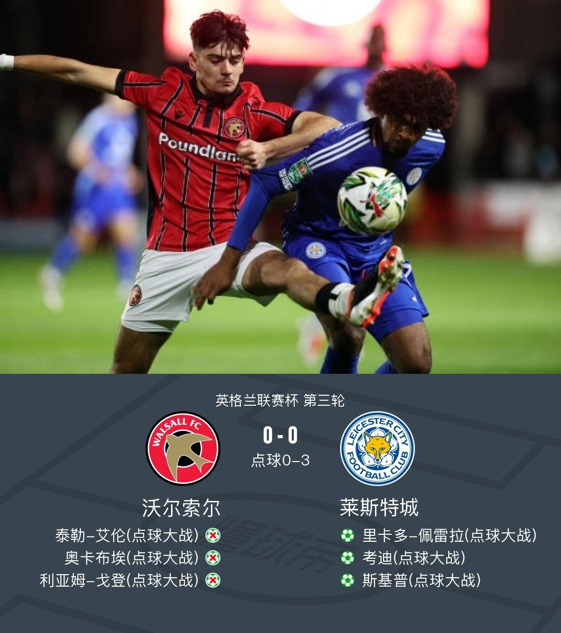 北京时间9月25日英格兰联赛杯 第三轮,沃尔索尔对阵莱斯特城。比赛中莱金禁区跟进推射打门,皮球被丹尼-沃德扑出,法昆多-博纳诺特抢点头球攻门偏出,法武塔突破抽射近角击中边网,常规时间两队战成平局,随后点球大战丹尼-沃德三连扑力保城门不失,斯基普罚入制胜点球,最终比分沃尔索尔 0- 3 莱斯特城。