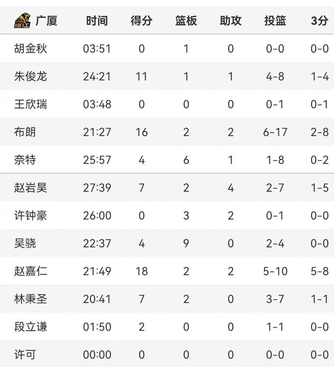 反观广厦队,这场比赛简直是被打得体无完肤啊!胡金秋4分钟0分1篮板的表现,让人不禁想问:难道是昨晚没吃饱饭吗?广厦队是不是该好好反思一下了?