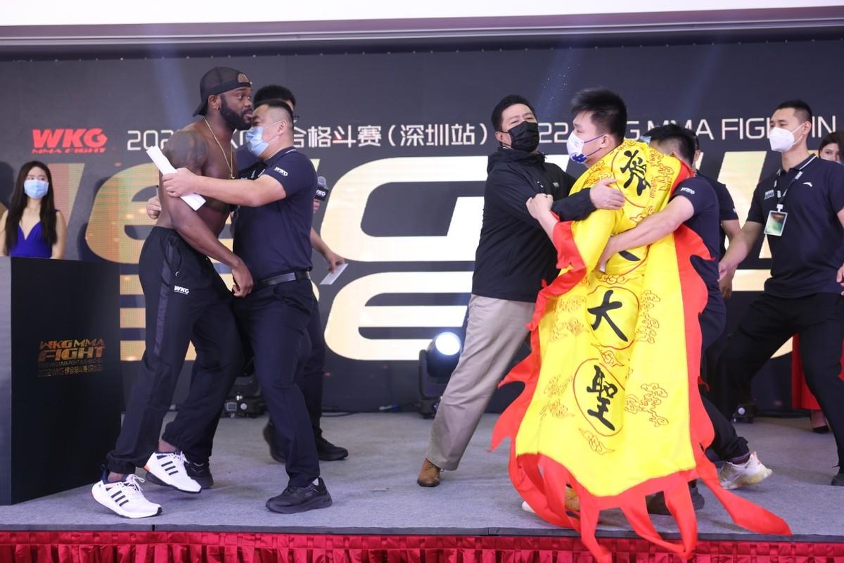副赛第五组,欧贝拉93KG VS 霍昌圣92.7KG,双方体重均完美通过,在对视时便爆发了激烈冲突,欧贝拉率先出手推搡“齐天大圣”霍昌圣,霍昌圣也不甘示弱冲上去就要出手,好在现场工作人员及时将选手分开。