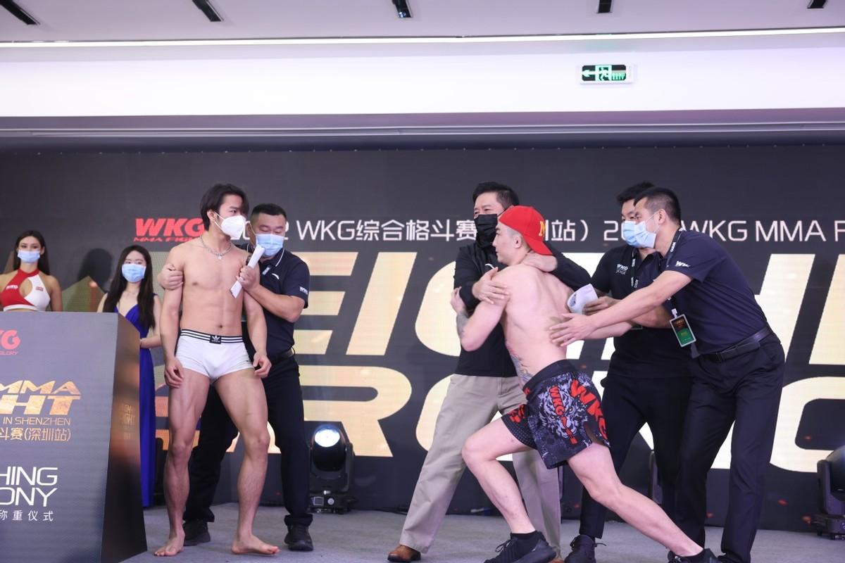 主赛第二组,程劲61.2KG VS 夏连洋61.1KG,双方体重均完美通过,但是在对视时同样产生了冲突,先是程劲出手推夏连洋,夏连洋后来又还了回去,两人间的大战一触即发,就等比赛场上见分晓。