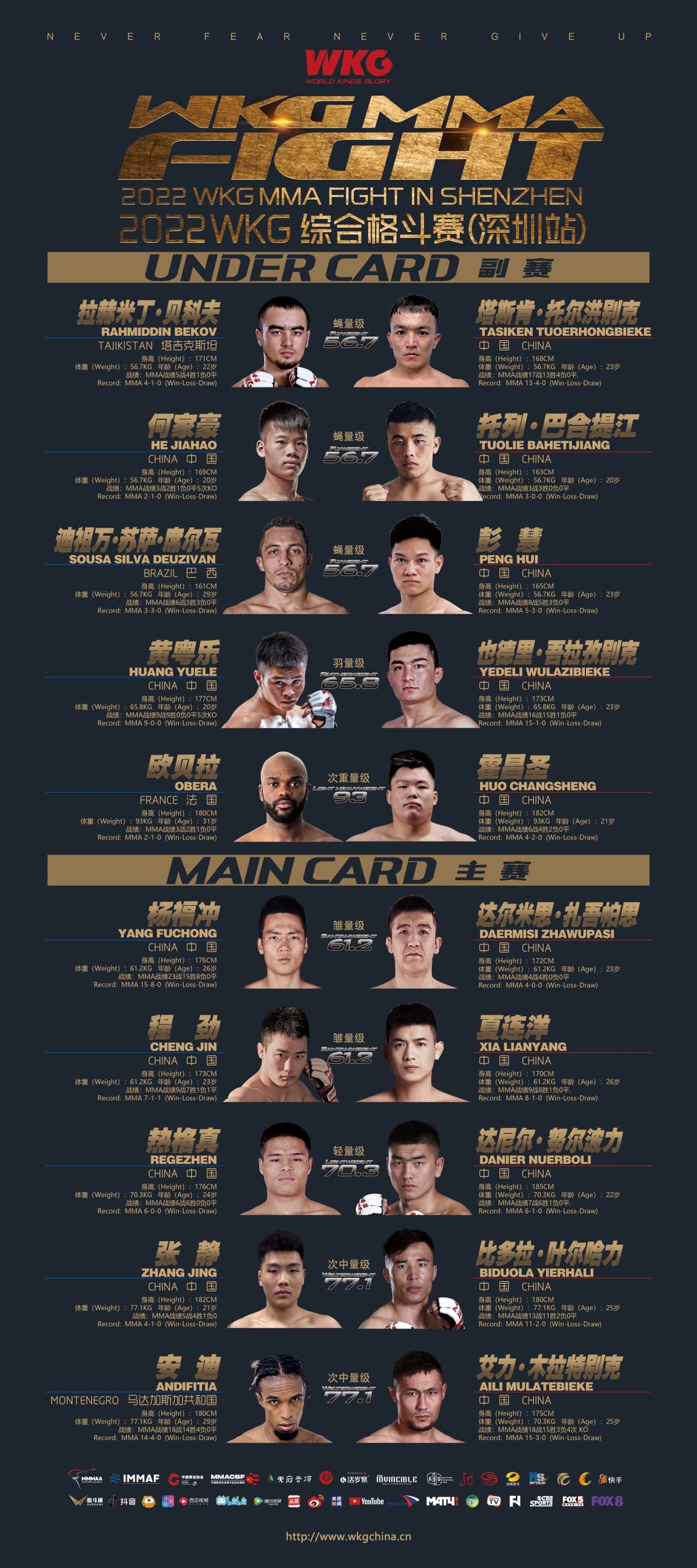 北京时间12月18日,WKG综合格斗赛时隔三年再次回归深圳。来自中国、法国、巴西、马达加斯加、塔吉克斯坦等5个国家,20位顶尖的格斗好手将捉对厮杀,为大家带来一场场激动人心的MMA大战。