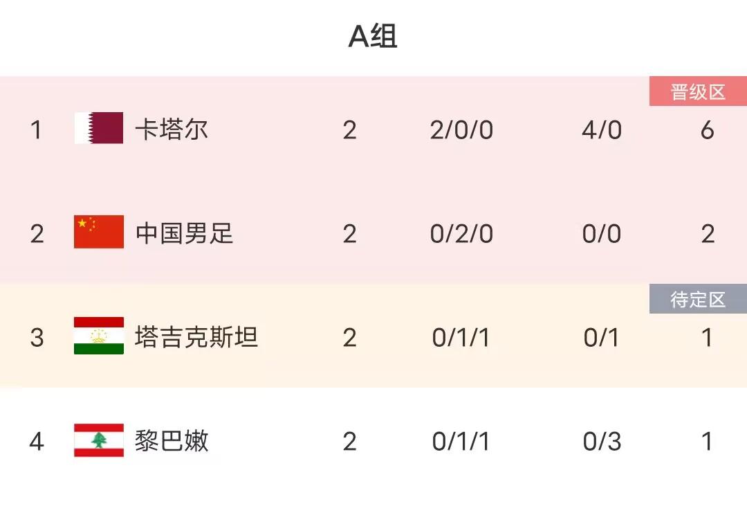 中国男足在小组赛前两场取得两分,均以0-0的相同比分战平塔吉克斯坦和黎巴嫩。本场对手卡塔尔两战全胜积6分已经锁定小组第一出线。