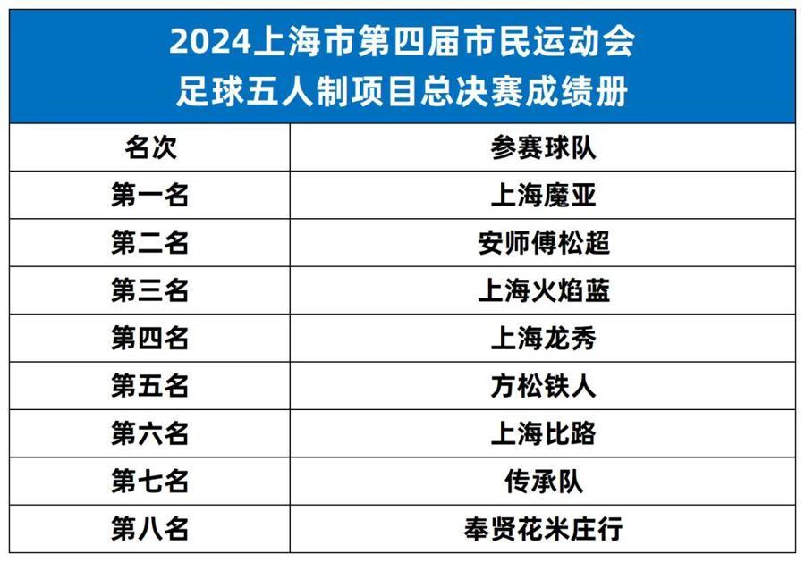 2024年上海市第四届市民运动会足球五人制项目总决赛日前在松江山河体育场落幕。经过24场精彩角逐,魔亚足球队夺得本次赛事冠军,安师傅松超队和上海火焰蓝队分别获得亚军和季军。