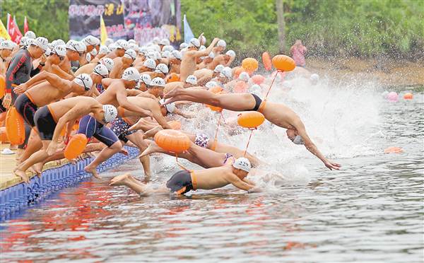8月8日是第9个全国“全民健身日”。当天,2017年重庆市公开水域游泳比赛在石柱土家族自治县黄水镇太阳湖举行,450余名市民渐次入水,用游泳竞速的方式庆祝“全民健身日”。