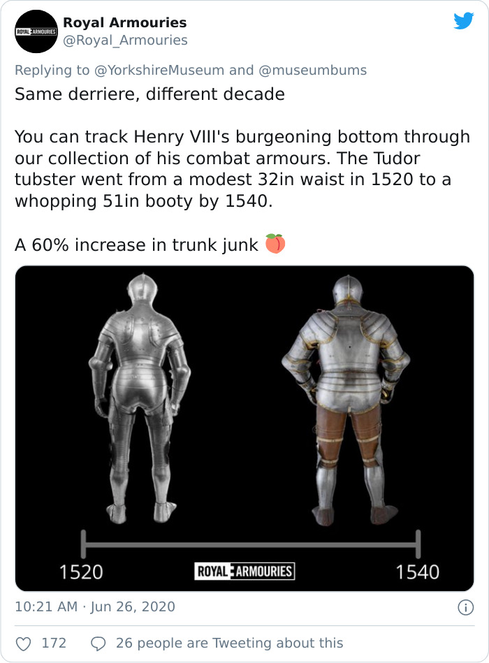 “你可以看到不同的时期亨利八世体型的变化,这些都是他的战斗盔甲,盔甲腰围从1520年代的32英寸,疯涨到1540年的51英寸,臀围可是涨了60%呢”