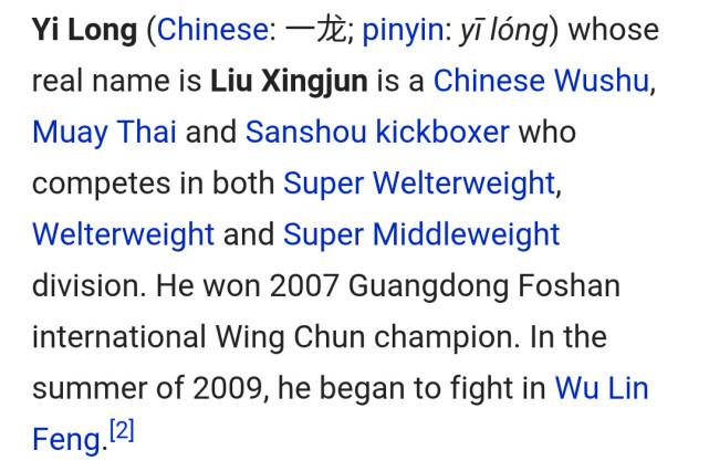 根据维基百科介绍,一龙原名刘星君,早年练习过武术、泰拳和散打,2007年获得过广东佛山国际咏春冠军,2009年开始参加武林风赛事。步入武林风八年来,一龙相继获得了2012年CIK世界冠军,2014年武林风73.5kg冠军,2014年S-1超中量级泰拳世界冠军,2015年WCK世界冠军,2016年武林风世界冠军。