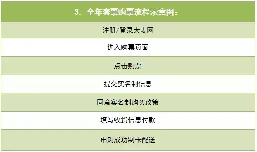 网上购票选择相应票价后进行在线支付并填写详细的收货地址,到期未成功支付的用户将视为自动放弃购买全年套票; 除按照网站页面的标准流程进行在线支付以外,其他支付方式我们一律不予受理。