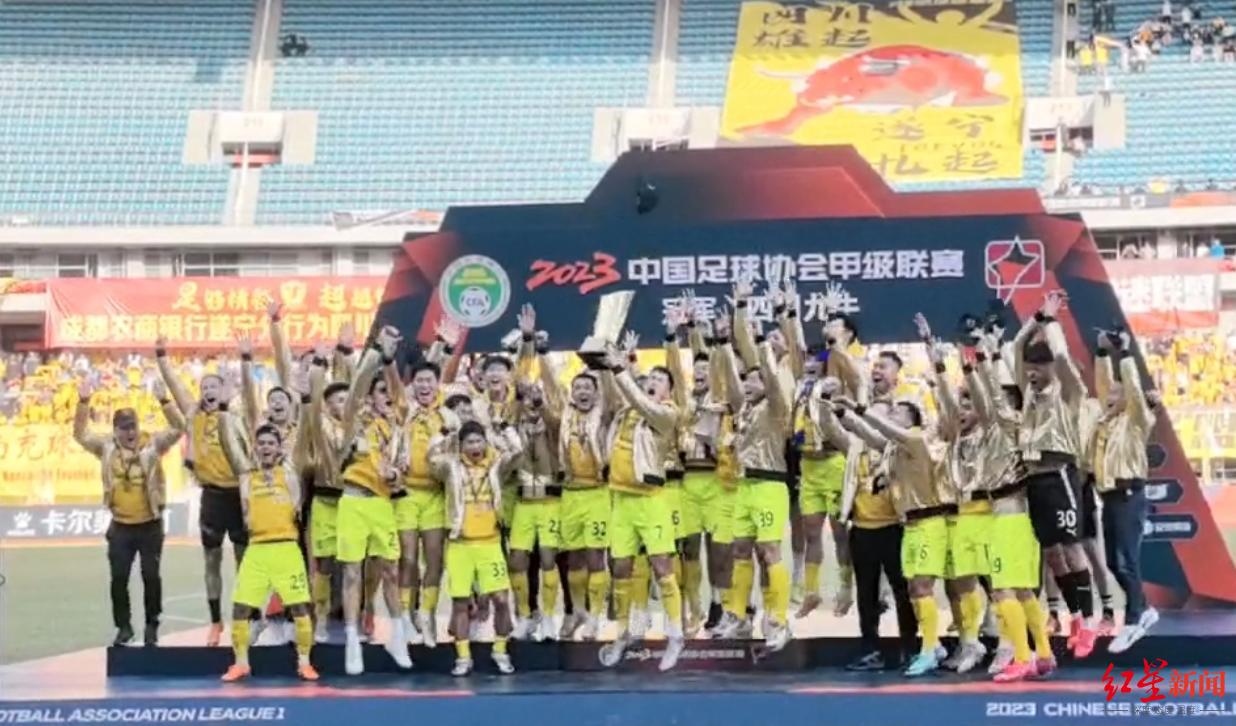 比赛结束后,遂宁市体育中心举行了盛大的2023赛季中甲联赛颁奖典礼。四川九牛将士穿上早就准备好的特制黄色冠军卫衣、金色冠军外套,戴上了黑色的冠军帽,开始了属于他们的庆典。中足联筹备组组长史强等嘉宾为四川九牛将士颁发了奖牌和奖杯,在四川九牛队长肖鲲举起中甲冠军奖杯的那一刻,也彻底点燃了全场的气氛。身披金色战衣的九牛将士们笑容灿烂、眼神坚定,这尊四川足球历史上的第一座中甲冠军奖杯是对他们一个赛季努力付出、追求卓越的回报,也是四川足球发展史上的重要篇章。