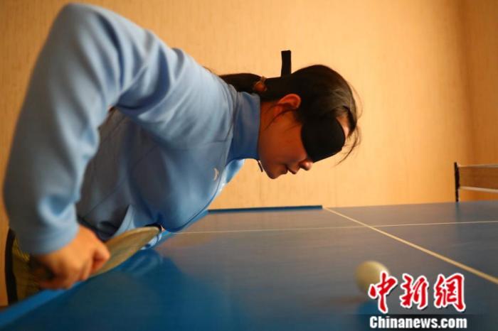 戴着黑色眼罩、触摸球桌站好、横握球拍俯身,李芳琴喊出一声“发球”,在听到队友回应“好”后,她快速将球击出,特殊乒乓球滚动中发出的声响,在训练室里四散开来。