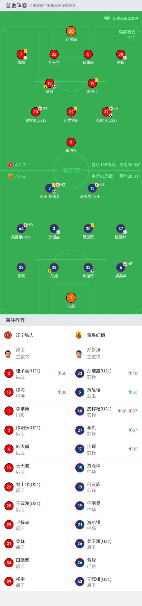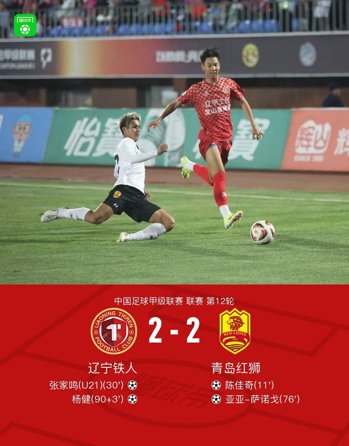 北京时间6月1日中国足球甲级联赛 联赛 第12轮,辽宁铁人主场对阵青岛红狮。此役,陈佳奇头槌首开记录,17岁小将张家鸣破门扳平比分,随后萨诺戈推射助青岛红狮再度领先,杨健宝刀未老补时绝平。最终,辽宁铁人主场2- 2战平青岛红狮。