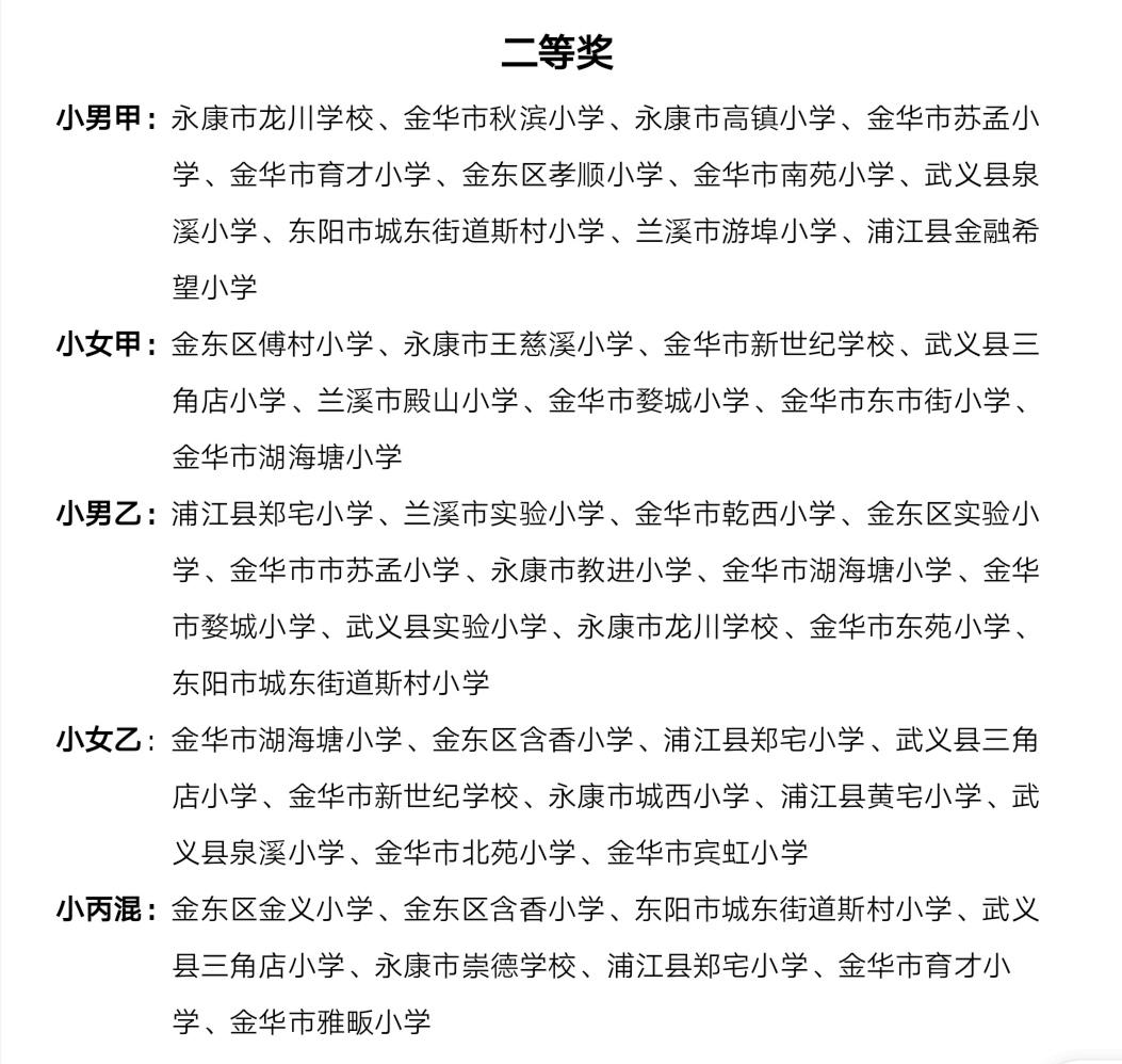 至此,历时6天的2021年金华市中小学校园足球春季联赛(小学组)落下帷幕,44支队伍1200多名运动员驰骋赛场,决出五个级别的名次。一、二等奖成绩如下: