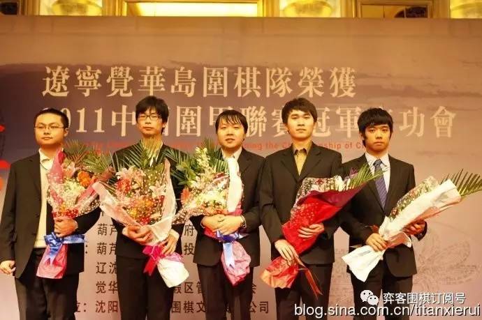 2011年“金立智能手机杯”围甲联赛辽宁觉华岛队夺冠棋手合影:唐韦星、孟泰龄、彭荃、马笑冰、郑淼鑫(从左至右)。