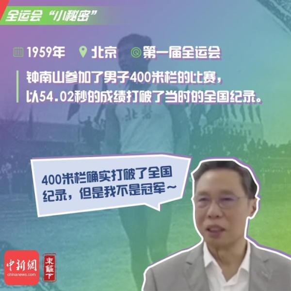 1959年在北京举行的第一届全运会上,还在北京医学院读书的钟南山参加了男子400米栏的比赛,并打破了当时的全国纪录。