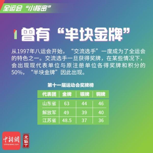 为了平衡各个地区的体育实力,从1997年八运会开始,“交流选手”一度成为了全运会的特色之一。各代表队自愿将选手输送到其它队伍,让其代表其他队比赛。交流选手一旦获得奖牌,在某些情况下,会出现现代表单位与原注册单位各得奖牌和积分的50%,“半块金牌”因此出现。