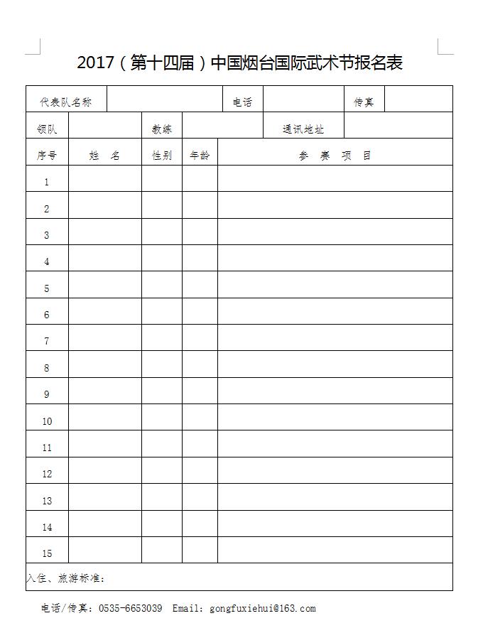 1、报名截止2017年7月18日,认真填写报名表并将费用及预定酒店标准寄至武术节组委会,电子版请发邮箱gongfuxiehui@163.com,逾期报名、未缴纳参赛费者将不予编排;