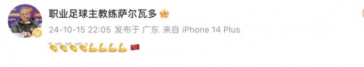直播吧10月15日讯 中国队世预赛2-1击败印尼收获首场胜利,赛后广州队主帅萨尔瓦多发文祝贺中国男足。