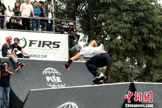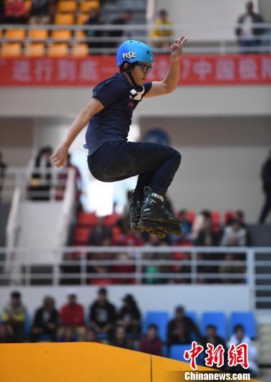 图为12月9日,一名极限轮滑运动员正在进行比赛项目。