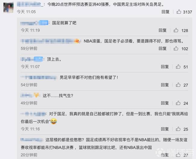 值得一提的是,今晚20:00国足的世预赛就将打响,在NBA官微的评论区,也有网友“好心”地提醒大家,同一时段有国足的比赛可以看。不过网友们对国足的态度还是有很大差别的,有的网友还在评论区里就到底看不看国足展开激烈的辩论。