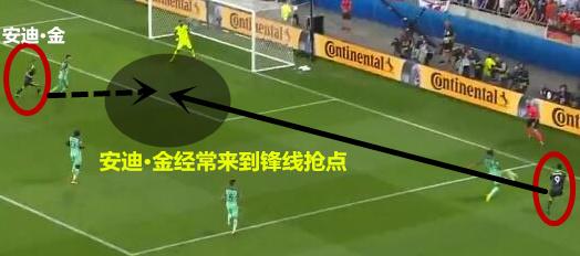 安迪•金在中场的组织力不足,主帅科尔曼所幸就让他在球场上更加深入对方的禁区,在本方前锋拿球的时候,他会适时插上抢点。就像这次机会,卡努在禁区外围利用个人能力突破下底,安迪•金则在中路插上抢点头球,这种套路是安迪•金最主要的人物之一。