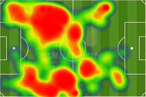 在缺少拉姆塞的情况下,贝尔的确孤掌难鸣。从这张热点图中我们能看到贝尔的活动范围几乎遍布整个中场和前场,如前文所讲,贝尔不得不频繁回撤拿球,在完成自己的任务外还要完成拉姆塞的任务,不过他身边的队友却不能给他以足够的支持,这就比较尴尬了。