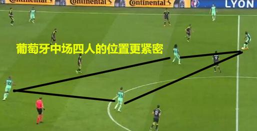 其次主教练这样安排也是希望球队的中场的联系更为紧密,就像这张图一样,当葡萄牙在左路控球时,四名中场以及身旁的球员差不多都是在左路及中路活动,这也每个人持球时都能更容易地找到队友。