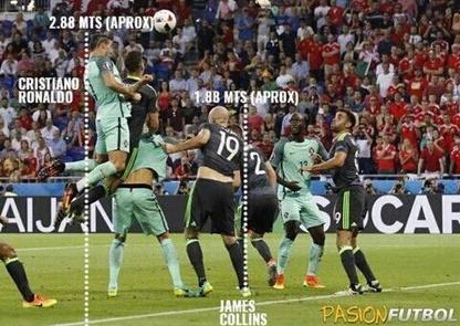 让我们再来看看C罗的弹跳,在他争顶的一刹那,他的头部距离地面的距离竟然达到2.88米,足足高出柯林斯1米。对于此球,《马卡报》表示:“C罗让历史都停留了几秒钟,这是他高高跳起将葡萄牙送入决赛的时间。都说人类不会飞翔,但C罗违反了物理定律,他停留在空中,主演了葡萄牙历史上永恒的片段。”