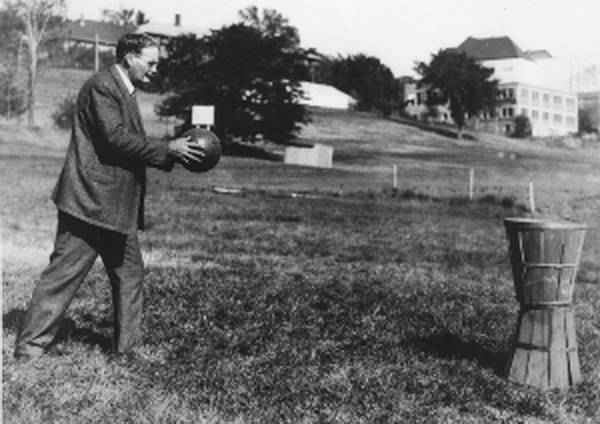 篮球运动是在1891年,由美国马萨诸塞州斯普林菲尔德市基督教青年会训练学校体育教师詹姆士·奈史密斯博士发明的。当时,在寒冷的冬季,缺乏室内进行体育活动的球类竞赛项目。奈史密斯从工人和儿童用球向“桃子筐”投准的游戏中得到启发,设计将两只桃篮分别钉在健身房内两端看台的栏杆上,桃篮口水平向上,距地面10英尺,以足球为比赛工具向篮内投掷,入篮得1分,按得分多少决定胜负。因为这项游戏最初使用的是桃篮和球,遂取名为篮球。1893 年铁质球篮取代了桃篮并悬挂了线网。1895年篮筐开始固定在4 × 6英尺的篮板上并逐渐深入场内,到1913年将篮网剪开,形成了近似现代的篮板和球篮。