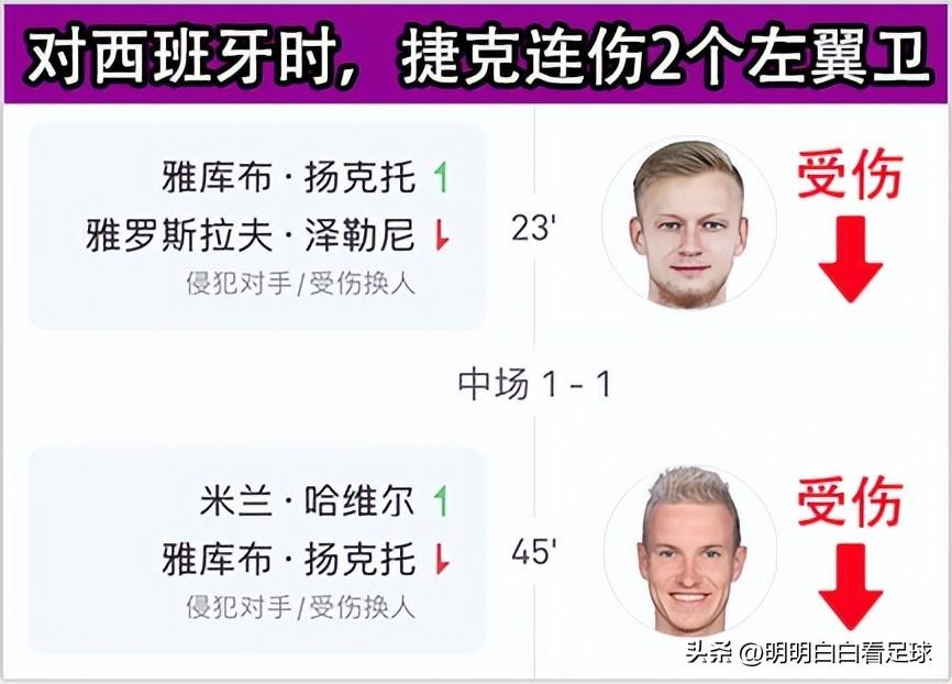 在对西班牙的比赛里,主力左翼卫泽勒尼24分钟受伤,顶替他的杨克托在46分钟也伤了,主力跟替补同时受伤,捷克左路防守是形同虚设啊,直接就被打穿了。