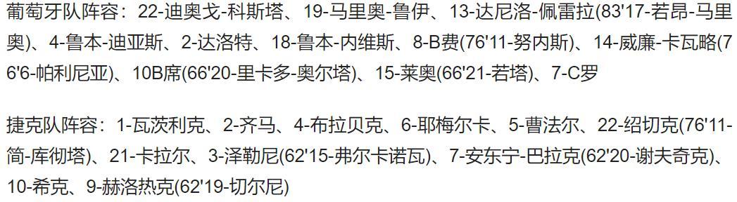葡萄牙首发:22-迪奥戈-科斯塔、20-坎塞洛、3-佩佩、13-达尼洛-佩雷拉、5-格雷罗、17-格德斯(88'8-穆蒂尼奥)、14-威廉-卡瓦略(68'11-B费)、18-鲁本-内维斯(88'6-帕利尼亚)、7-C罗、21-若塔(80'15-莱奥)、10-B席(68'23-维蒂尼亚)