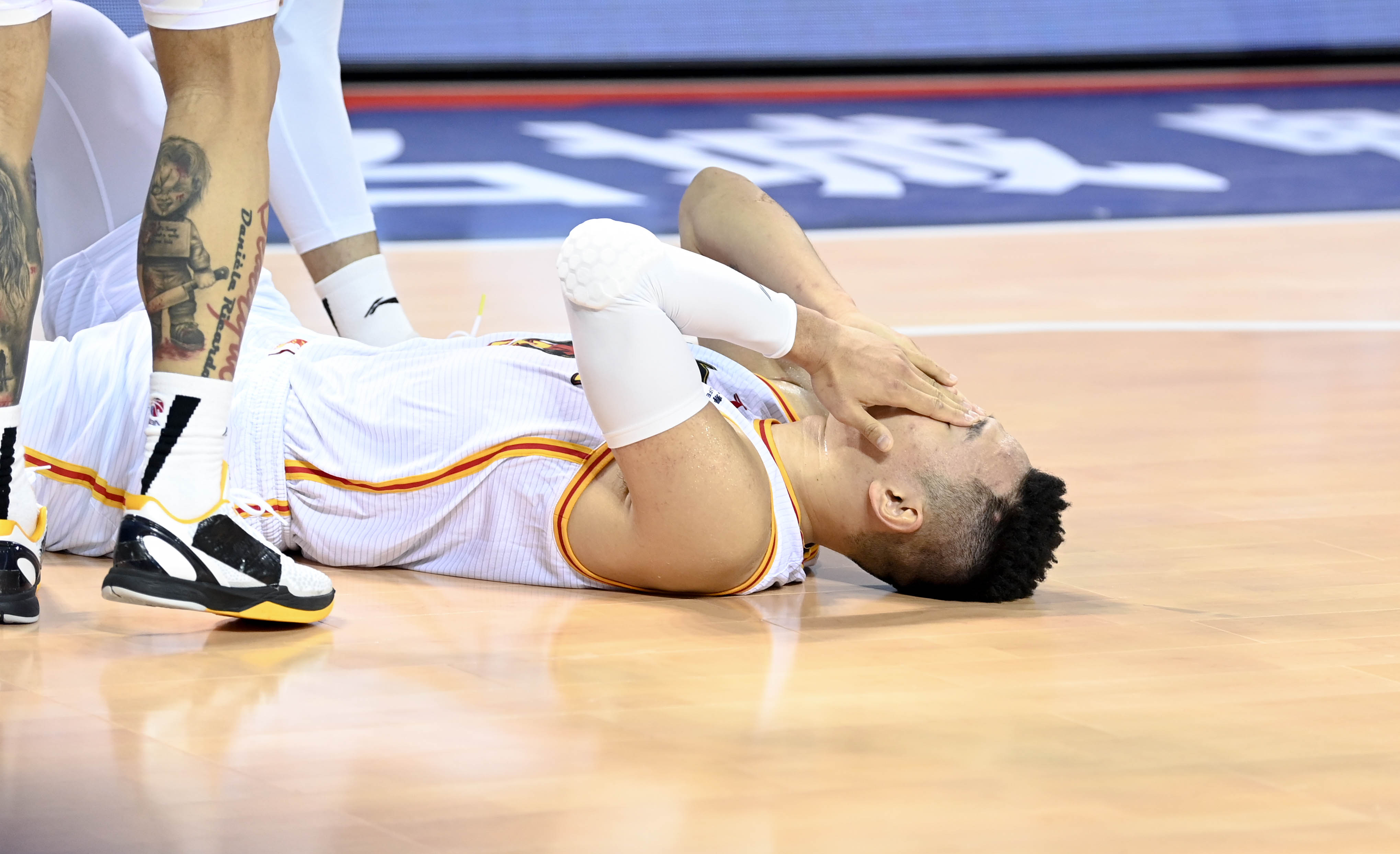 1月11日,深圳马可波罗队球员贺希宁在比赛中倒地。 新华社记者 颜麟蕴 摄