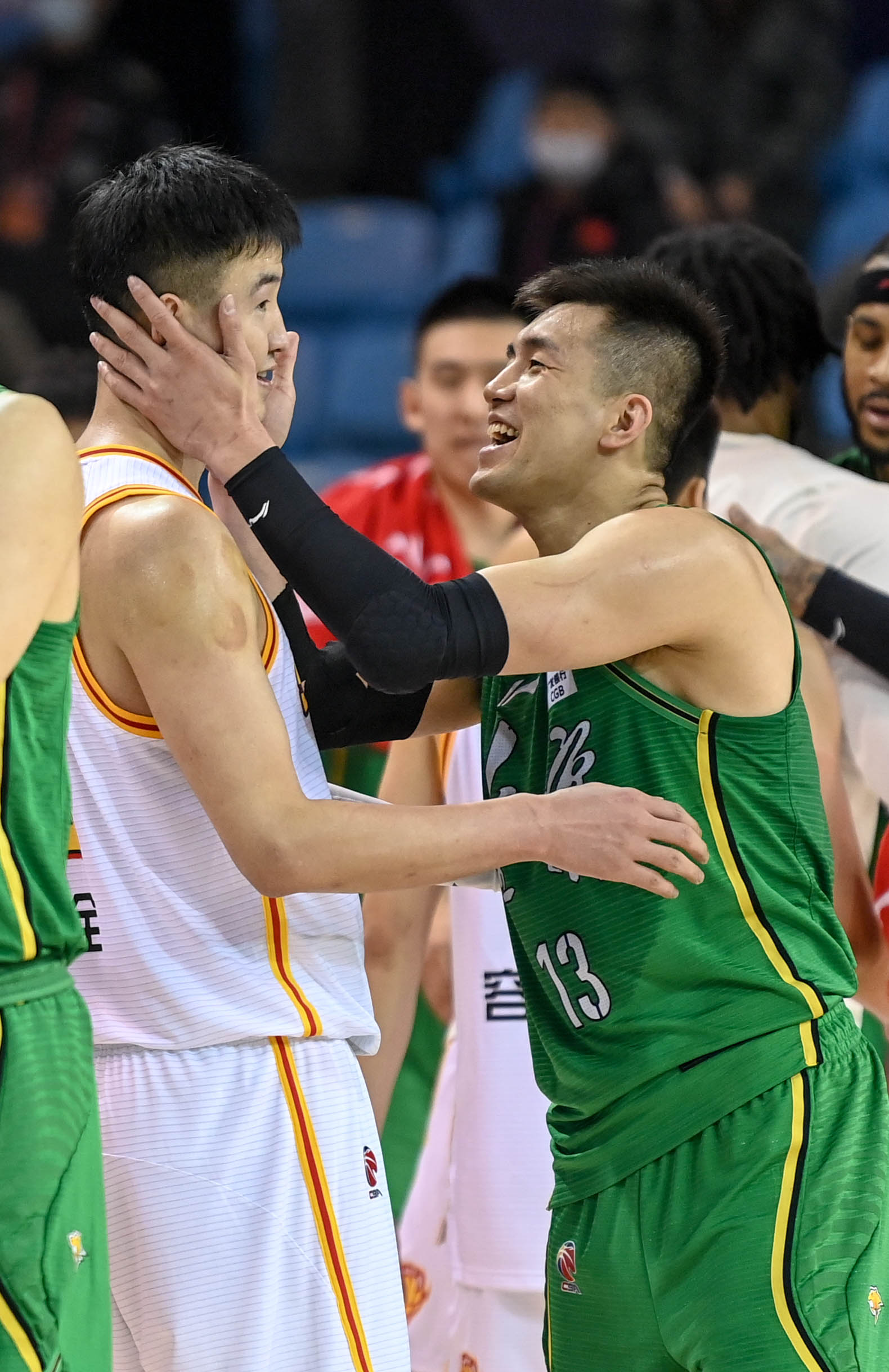 1月11日,辽宁本钢队球员郭艾伦(右)赛后与深圳马可波罗队球员顾全交谈。 新华社记者 颜麟蕴 摄