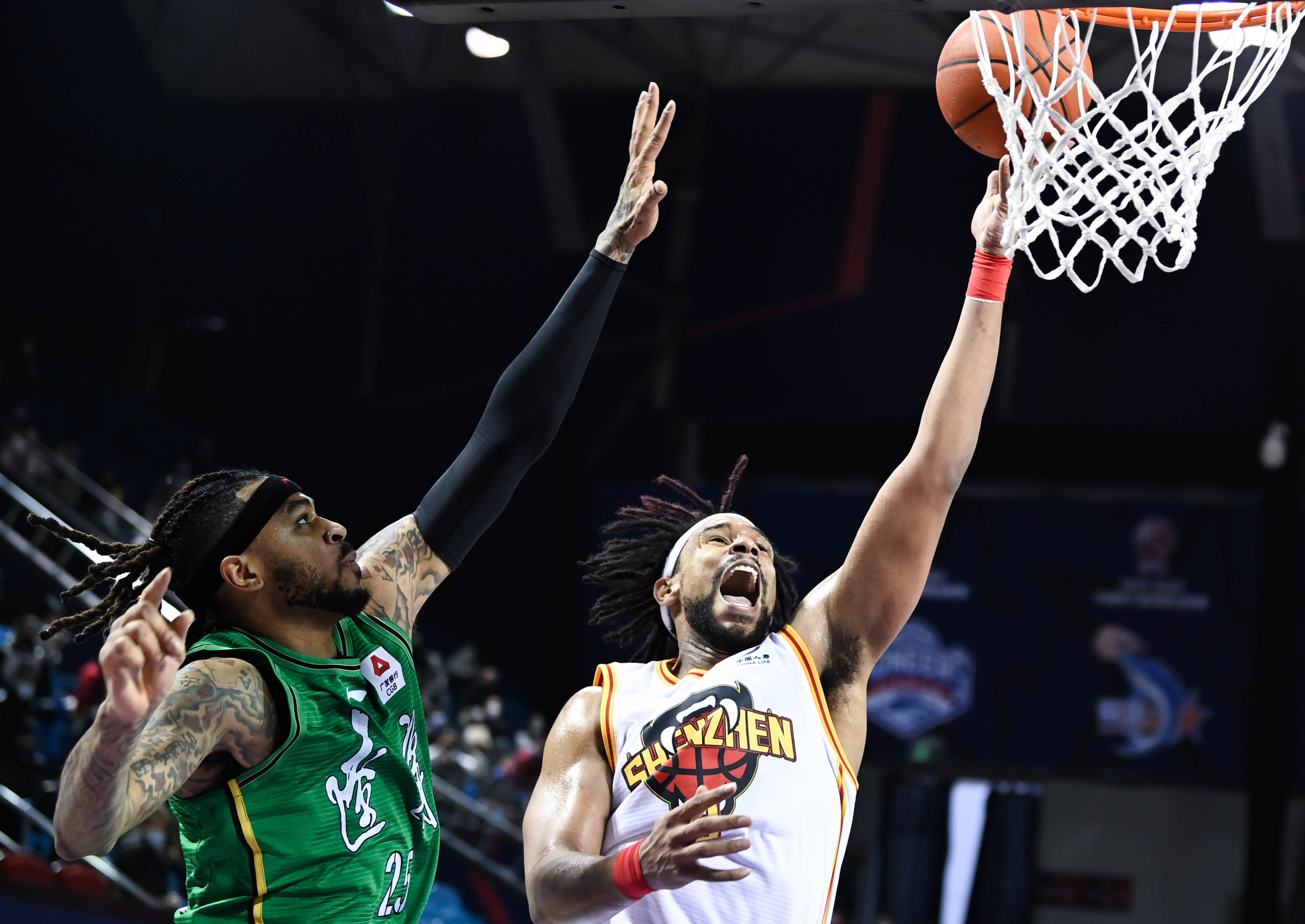 1月11日,辽宁本钢队球员莫兰德(左)防守深圳马可波罗队球员萨林杰上篮。 新华社记者 颜麟蕴 摄