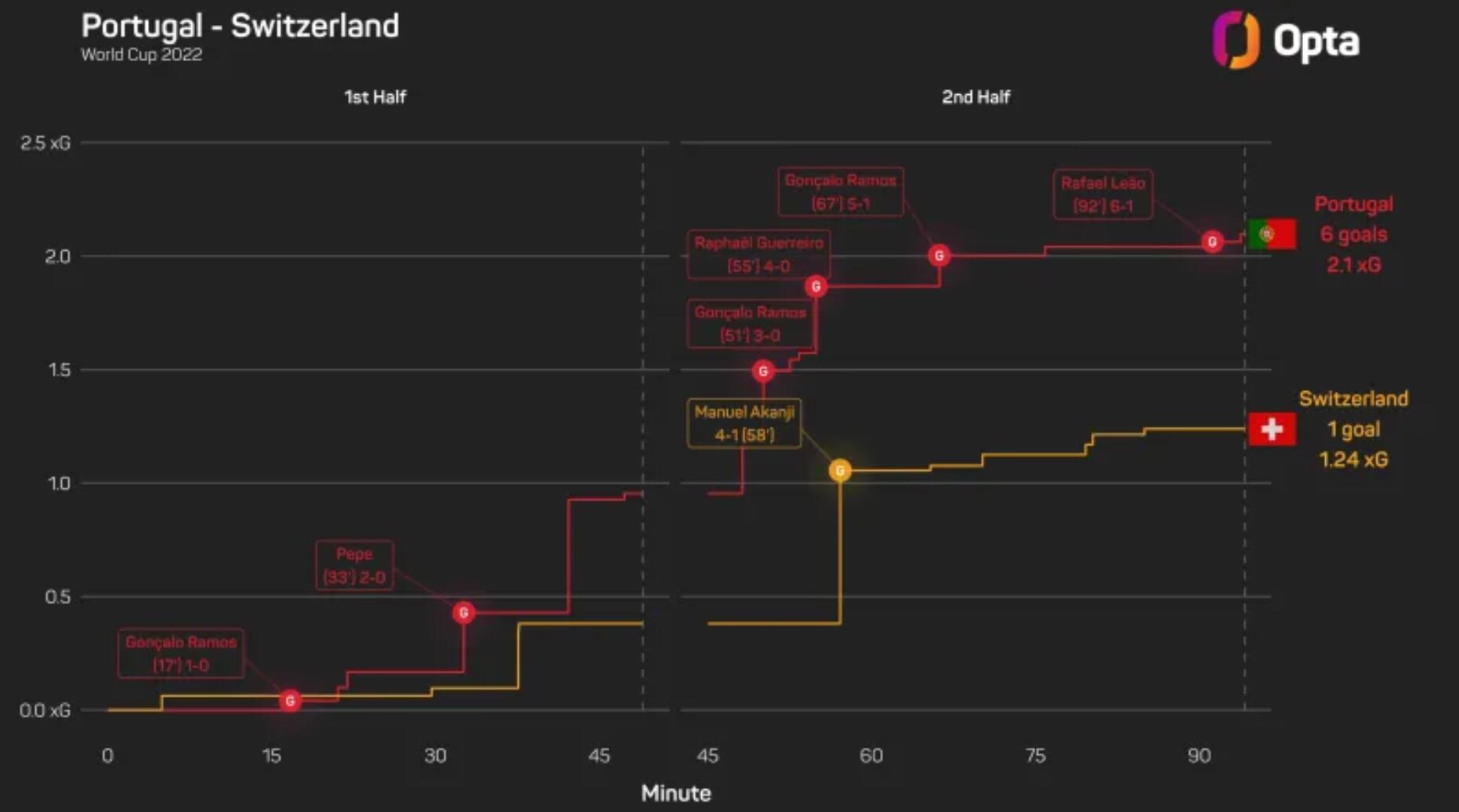 世界杯1/8决赛葡萄牙对阵瑞士,贡萨洛-拉莫斯打进3球、佩佩、格雷罗、莱奥破门,阿坎吉扳回一个,葡萄6-1战胜瑞士,晋级8强。