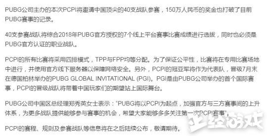根据公告,PUBG公司主办的本次PCPI将邀请中国顶尖的40支战队参赛,奖金也达到了创纪录的150万人民币。