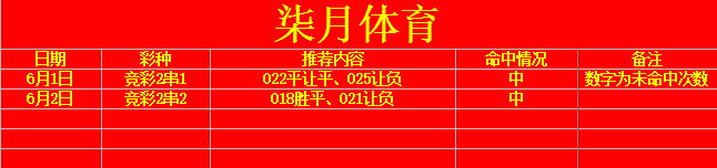 6月竞彩2串1总成绩:2推2红,总场次4中4