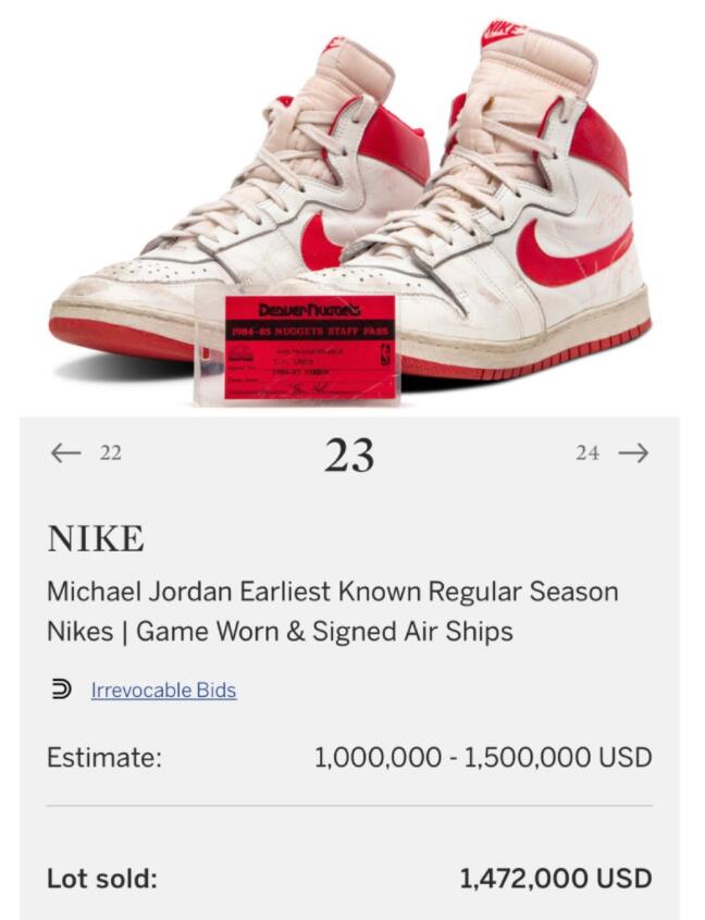 一双迈克尔-乔丹在新秀赛季穿过的球鞋卖出147.2万美元的天价,刷新比赛穿过的运动鞋拍卖纪录。