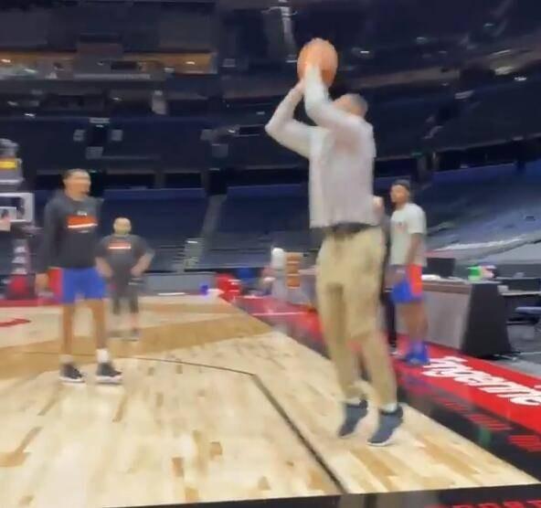 直播吧12月31日讯 尼克斯明天将迎战猛龙,在今天的训练中,球队名宿、现任总经理助理的阿兰-休斯顿秀了一手投篮。
