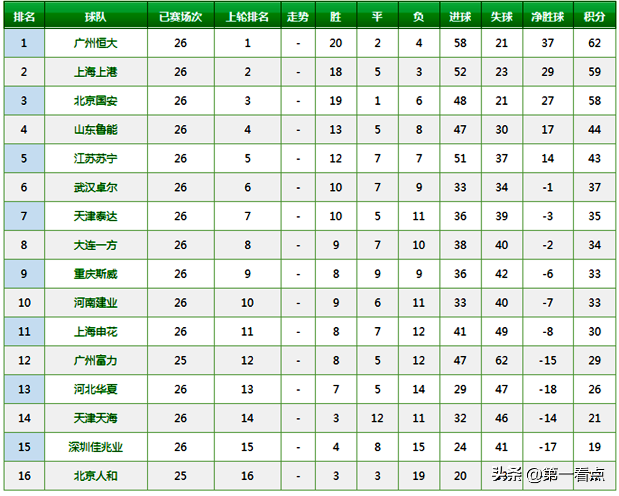 联赛26轮过后,广州恒大以3分的优势继续领跑积分榜。上海上港暂居此席,北京国安跌落至第三。山东鲁能、江苏苏宁、武汉卓尔分列4-6位。少赛一轮的北京人和积分垫底,几乎已经预定一个降级名额。深圳佳兆业倒数第二,天津天海暂时逃离降级区。在联赛还剩4轮的情况下,夺冠和保级形势还存在许多未知因素。