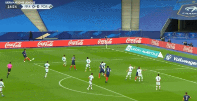 第16分钟,博格巴中场中路超过40米超远直塞打穿葡萄牙防线,姆巴佩单刀推射被帕特里西奥扑出。