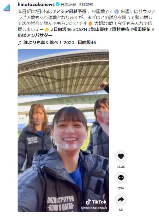 日本知名女子偶像团体组合“日向坂46”发视频为日本队助威,在日本网络上受到关注