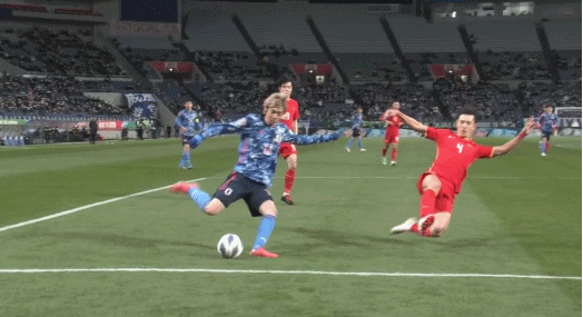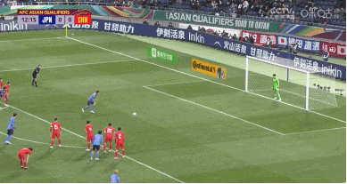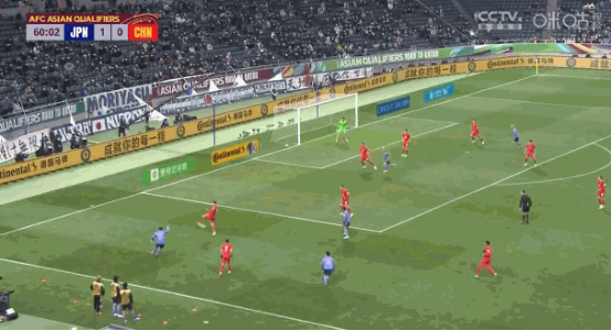 日本队左路下底传中,前锋伊东纯也在禁区内头球攻门,2:0领先中国队