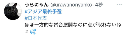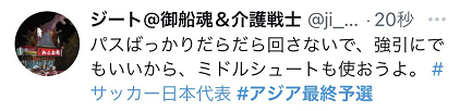 不过,虽然日本队在控球率、射门次数等数据上有着压倒性优势,但在接下来很长的一段时间内,日本队未能进球。这也让不少日本网友开始感到焦急,有人出主意说:“别拖来拖去地传球了,就算牵强也行,在中距离射门吧。”