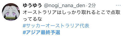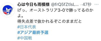 另一方面,于北京时间17时10分开始的澳大利亚队对阵越南队的比赛则吸引了不少日本网民的注意。在两场比赛结果出炉前,日本队积12分位列小组第二,而澳大利亚积11分紧追其后。在中日对决进入近乎“停滞”的状态时,日本网民开始关心澳大利亚队的比赛情况。
