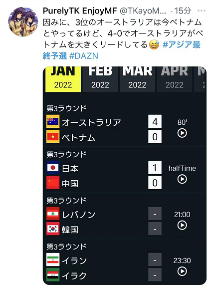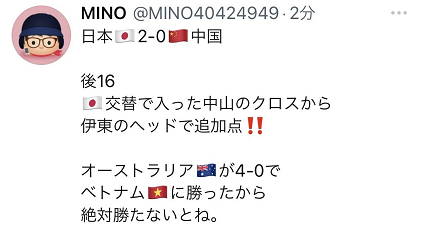此外,在进球之际,仍有日本网民提及“澳大利亚4:0战胜越南,所以日本队也必须获胜。”