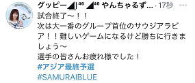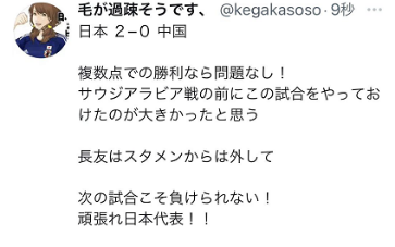 2:0的比分也被保持到比赛结束,最终日本队从与中国队的比赛中取得3分小组积分。比赛结束后,虽然有些人开心地发帖庆祝,但也有也有不少日本网民早就看向了下一场对阵小组第一沙特阿拉伯的比赛。有人说:“既然是多球胜利那就没得可挑剔!能够在对阵沙特前踢这场比赛很重要。把长友(佑都)踢出首发,下一场比赛才是绝对不能输,加油日本!”