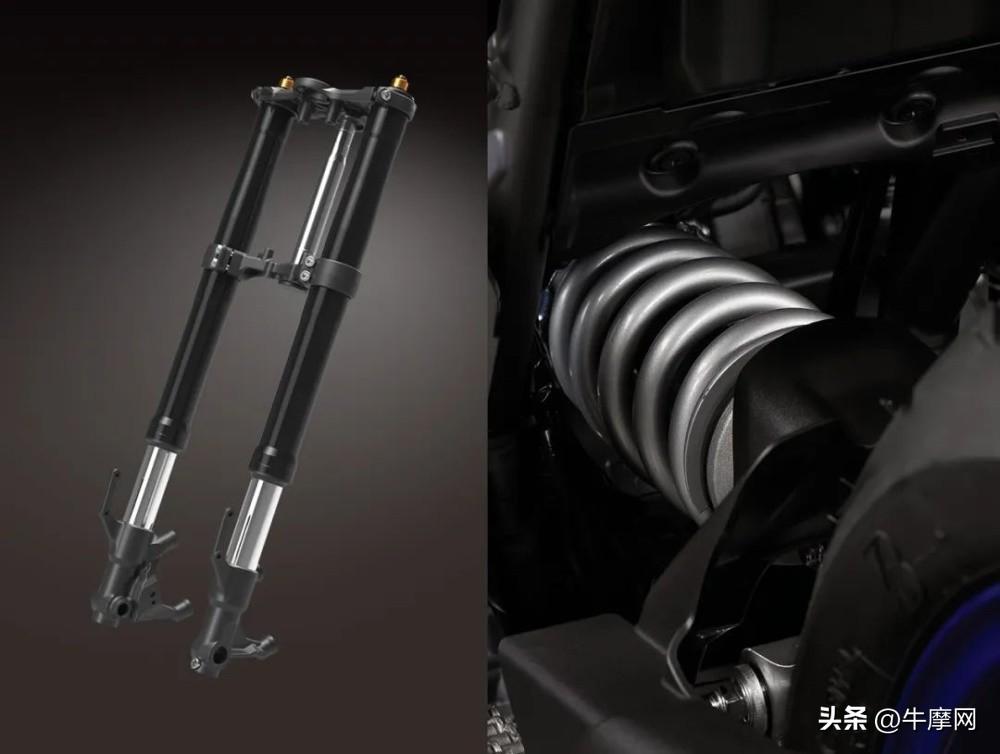 悬挂系统YZF-R7使用了41 mm全段可调的KYB倒置前减震,后减震则是水平多连杆式的,预载、回弹阻尼皆可调,前后减震行程都为130 mm。改短的前减行程不仅带来了轴距变化,也使得它的倾角极限更大,显然更符合车辆定位。
