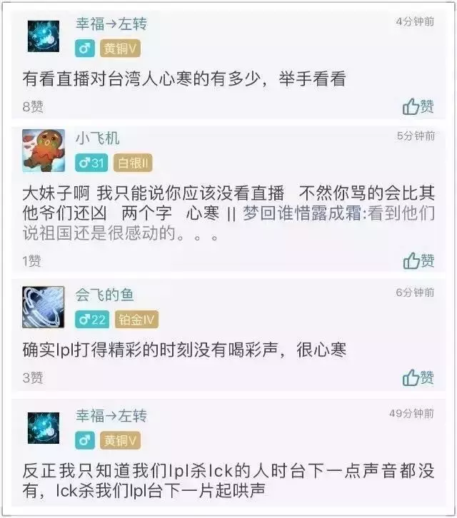 与之形成鲜明对照的是,决赛前,台湾LMS联队与韩国LCK联队对战时,大陆电竞迷透过网络表达支持的比例高达80%,两岸年轻人对待对岸的态度形成鲜明的对比,让许多看了直播的大陆网友十分心寒!