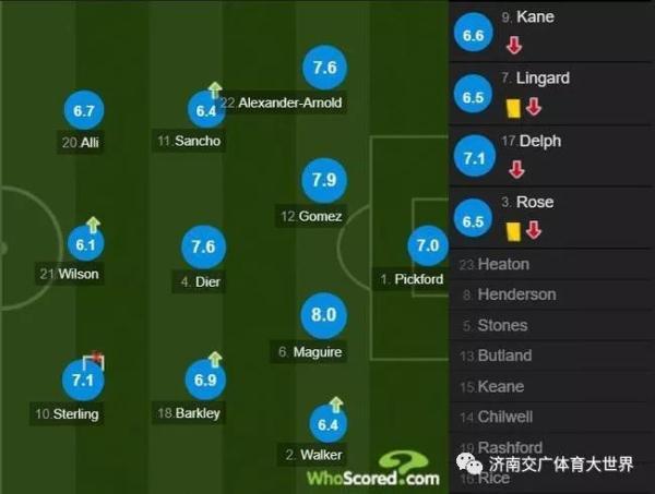 英格兰:1-皮克福德/22-阿诺德、12-戈麦斯、6-马奎尔、3-罗斯(2-沃克 69’)/17-德尔夫(18-巴克利 106’)、4-戴尔、7-林加德(11-桑乔 106’)/20-阿里、10-斯特林、9-凯恩(21-威尔逊 75’)